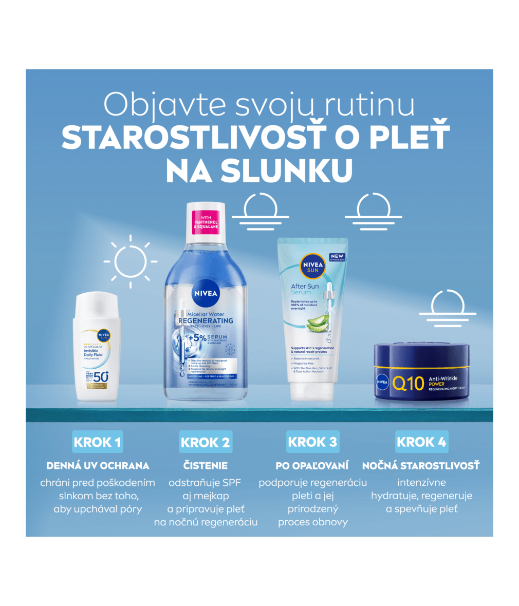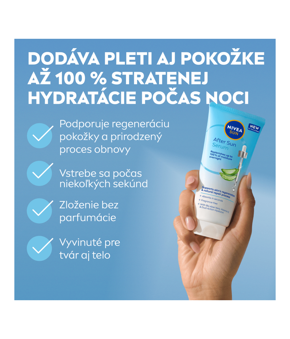 Prvé sérum na opaľovanie na tvár i telo! Doprajte svojej pleti a pokožke okamžitú úľavu po opaľovaní s NIVEA Sun Sérom po opaľovaní. Jeho ľahké a bezparfumové zloženie sa vstrebáva v priebehu sekúnd. Počas noci vašej pokožke doplní až 100 % stratenej hydratácie.