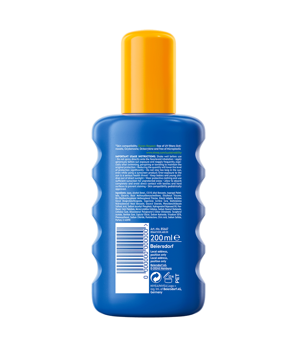 Ochrana i zábava v jednom spreji! Vodoodolný sprej na opaľovanie s farbami, ktoré po rozotrení zmiznú. Zvoľte intenzívnu a spoľahlivú ochranu: NIVEA Detský farebný sprej na opaľovanie Protect & Care SPF 50+.