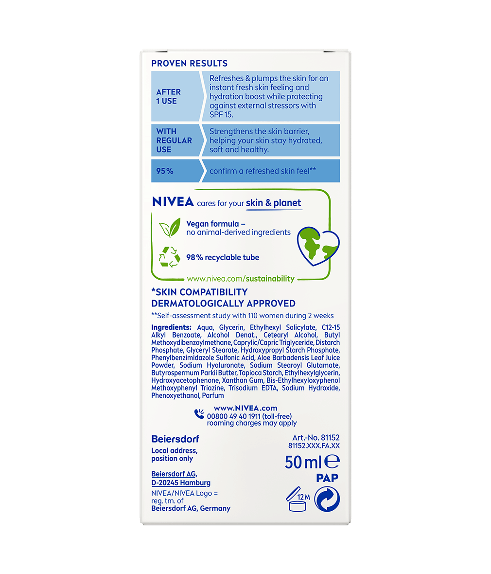 Objavte ľahký hydratačný krém, ktorý pleti dodá starostlivosť a ochranu, ktorú potrebuje. Každý deň. Vyskúšajte NIVEA Hydratačný denný krém SPF 15.