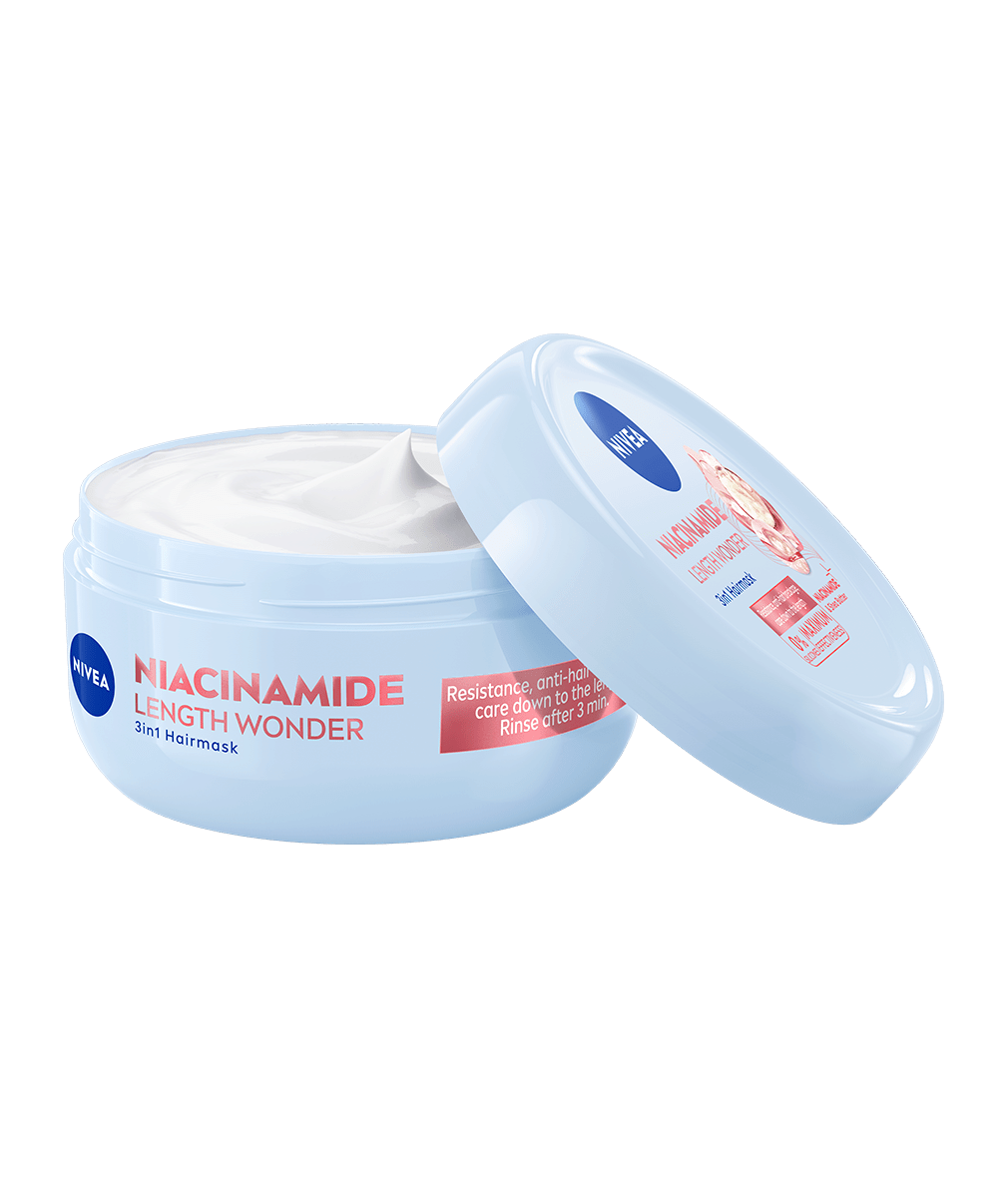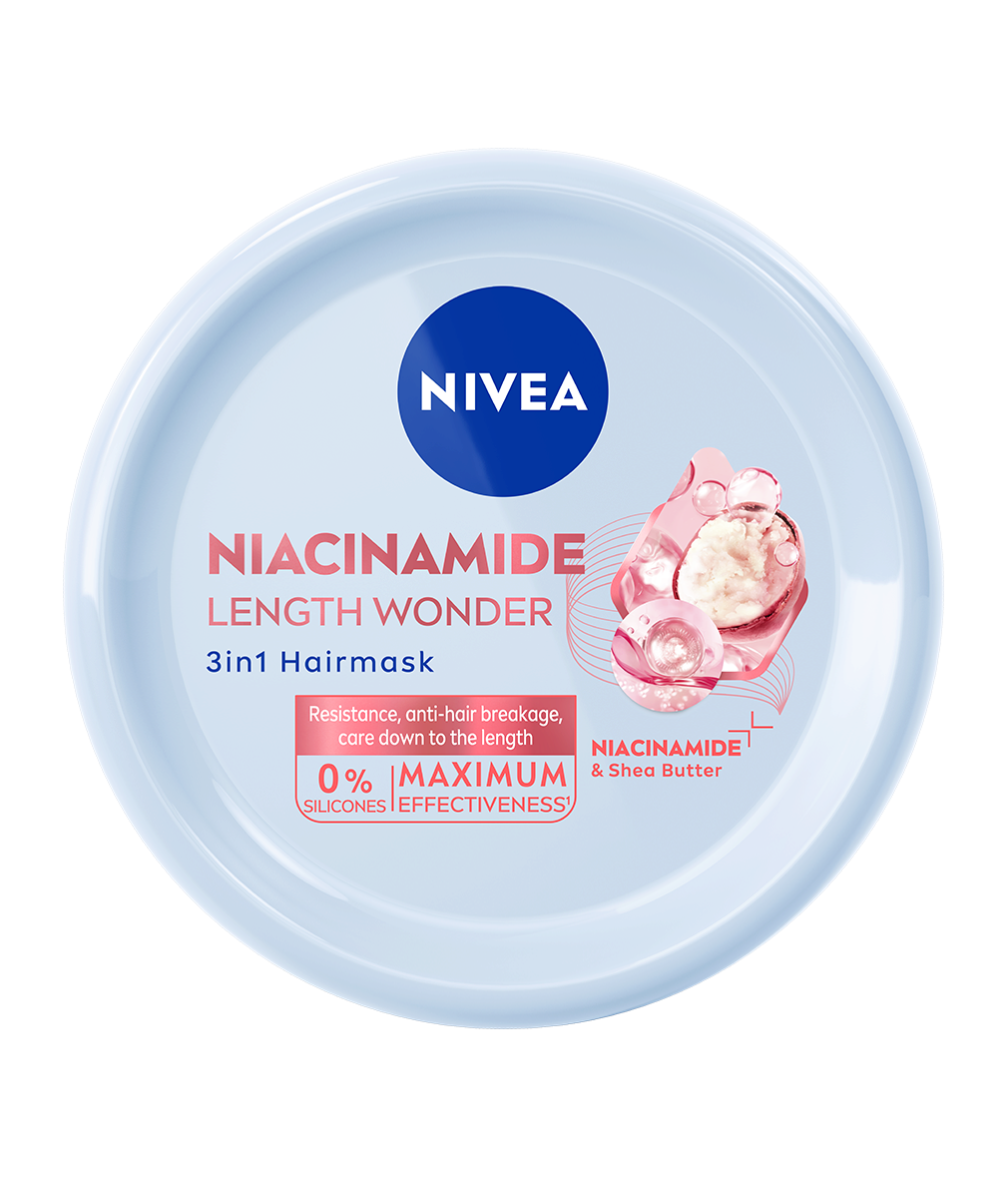 Maska na vlasy NIVEA Length Wonder s niacínamidom a bambuckým maslom posilňuje vlasy, chráni ich pred lámaním a ošetruje ich celú dĺžku – bez silikónov.
