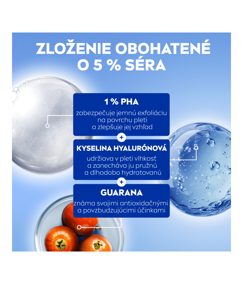 - S 5 % séra: 1 % PHA, kyselinou hyalurónovou a guaranou