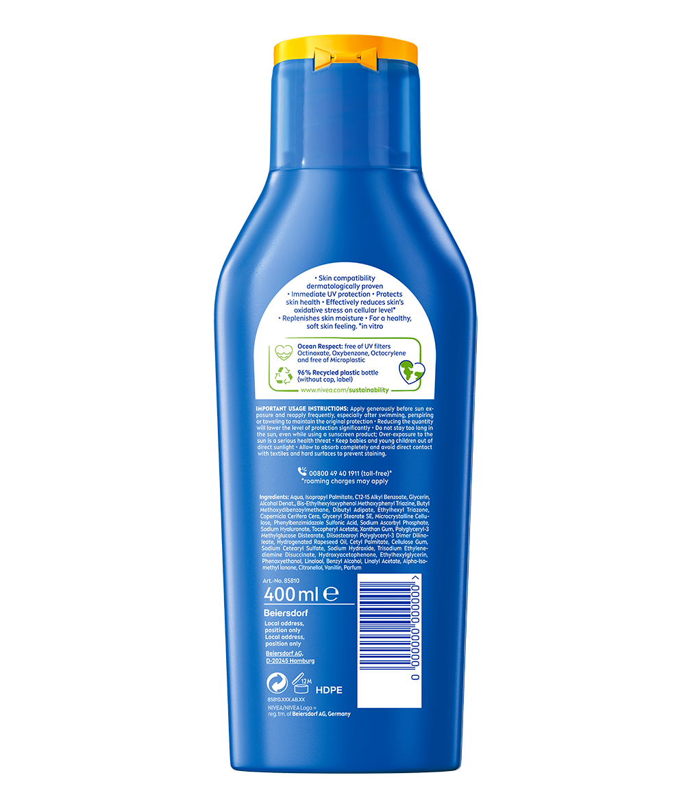Chráni pokožku pred UVA a UVB žiarením a zároveň hĺbkovo hydratuje. Zloženie s vitamínom C a kyselinou hyalurónovou pre 48-hodinovú hydratáciu: NIVEA Mlieko na opaľovanie Protect & Moisture SPF 30.