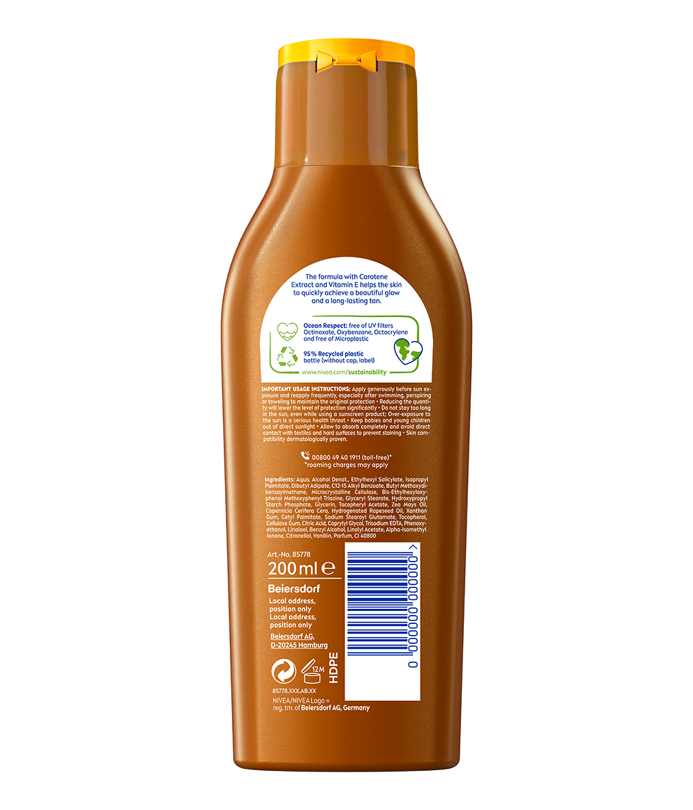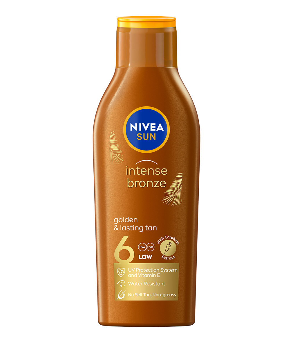 Získajte zlatisté opálenie, ktorým sa budete chváliť i dlhé týždne! Ľahké zloženie s beta karoténom vašu pokožku rozžiari: NIVEA Mlieko na opaľovanie Tropical Bronze SPF 6. Vyskúšajte značku slnečnej kozmetiky č. 1 na svete.*