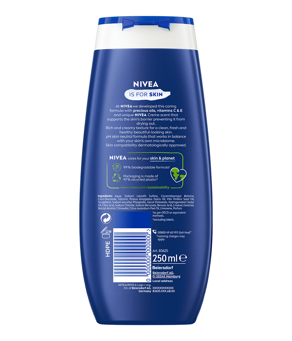 Premeňte každodennú sprchu na jedinečný zážitok. Príjemná vôňa uvoľní vašu myseľ a jemné zloženie s provitamínmi C a E a vzácnymi olejmi bude rozmaznávať vašu pokožku bez toho, aby narušilo jej prirodzenú mikrobiálnu vrstvu. Zároveň chráni nielen vás, ale aj životné prostredie. Fľaša je totiž z 98 % z recyklovaného plastu. Pocit dokonale čistej a vyživenej pokožky vám navyše vydrží i po osušení uterákom. Zverte svoje telo do starostlivosti kvalitnej sprchovej kozmetiky. Stavte na: NIVEA Ošetrujúci sprchovací gél Creme Care.