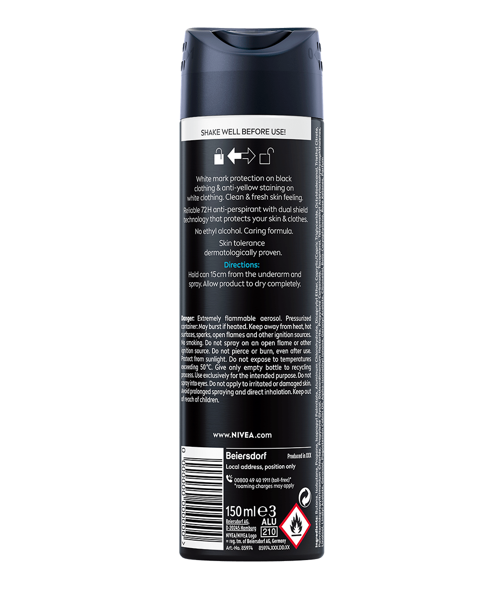 Spoľahnite sa na účinnú ochranu proti poteniu a vzniku škvŕn na oblečení. Majte všetko pod kontrolou: NIVEA MEN Sprej antiperspirant pre mužov Black & White Invisible Fresh.