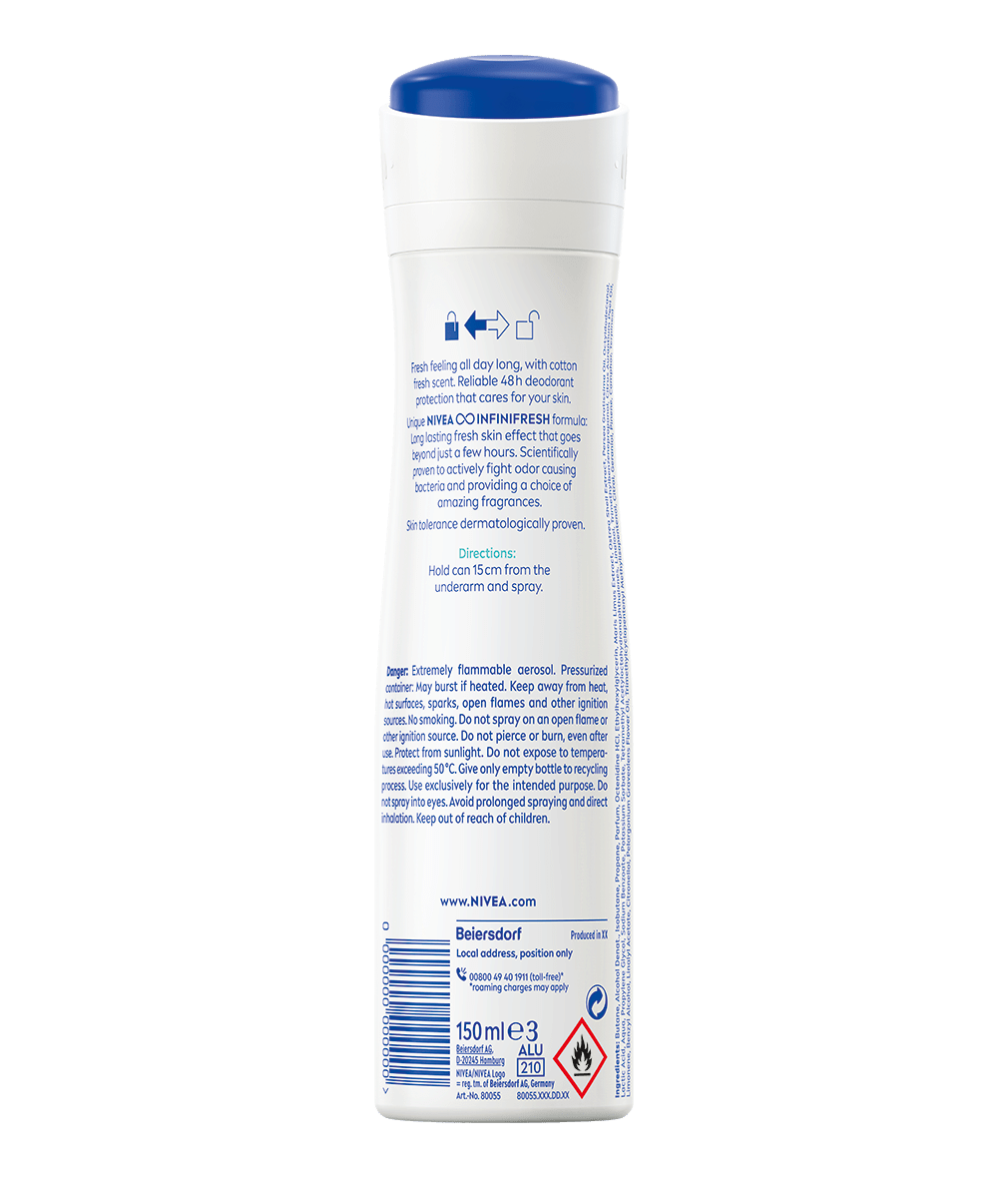 Rozlúčte sa s nepríjemným zápachom potu a užívajte si nekončiaci pocit sviežosti! Dezodorant v spreji vás ochráni až na 48 hodín. Vyskúšajte: NIVEA Sprej dezodorant Fresh Comfort.