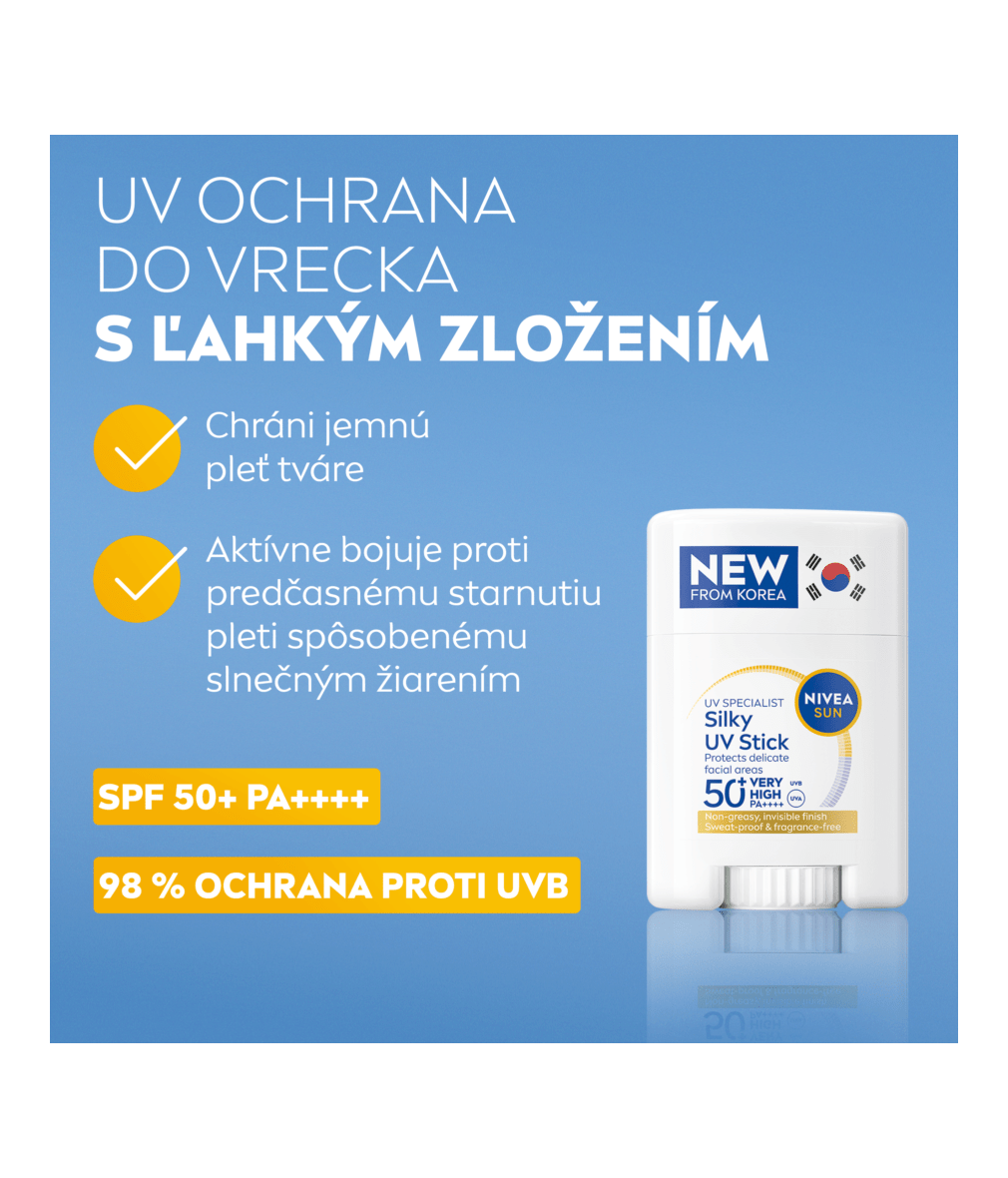 Vytvorili sme silky UV stick technológiu, ktorá k vám prichádza priamo z kozmetického raja - Južnej Kórey. Tyčinka zanecháva na pleti zamatovo hebký pocit, jemne sa rozotiera a je úplne neviditeľná na všetkých tónoch pleti, bez mastného a lepivého pocitu. Využijete ju na cestách, skladné 15 g balenie sa zmestí aj do kabelky. Tyčinka je odolná voči vode i potu, dermatologicky a oftalmologicky testovaná pre šetrnosť k pleti a očiam. Je nekomedogénna, bez parfumu a vhodná pre všetky typy pleti, vrátane citlivej. Navyše rešpektuje oceány a je bez mikroplastov.