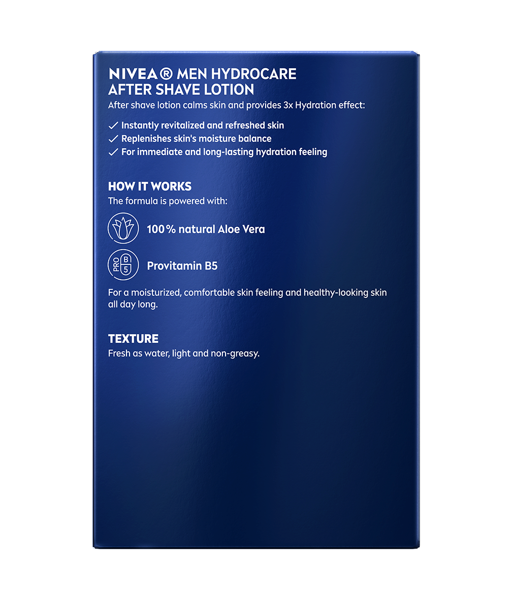 Majte vždy po holení sviežu a zdravo vyzerajúcu pleť vďaka aktívnym zvláčňujúcim látkam, provitamínu B5 a aloe vera. Stavte na klasiku: NIVEA MEN Voda po holení Hydrocare.