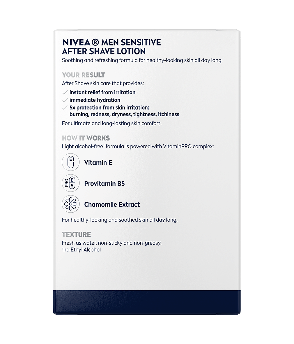 Zatočte s podráždenou pleťou a zabudnite na drobné ranky i svrbenie po holení! Spoľahnite sa na silu harmančeka, vitamínu E a provitamínu B5: NIVEA MEN Voda po holení Sensitive.
