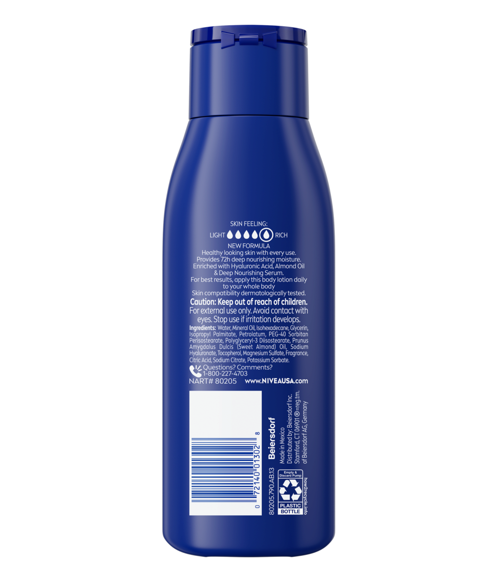 Výživné telové mlieko NIVEA Body Milk so 100 % čistou kyselinou hyalurónovou, prírodným mandľovým olejom a hĺbkovo vyživujúcim sérom dodáva pokožke extra porciu hydratácie a hĺbkovej výživy. Čistá kyselina hyalurónová posilňuje schopnosť pokožky zadržiavať vlhkosť pre dlhodobú hydratáciu – teraz až 72 hodín! Doprajte svojej pokožke každodennú výživu, ktorú si zaslúži, so starostlivosťou pre zdravý vzhľad pokožky pri každom použití.